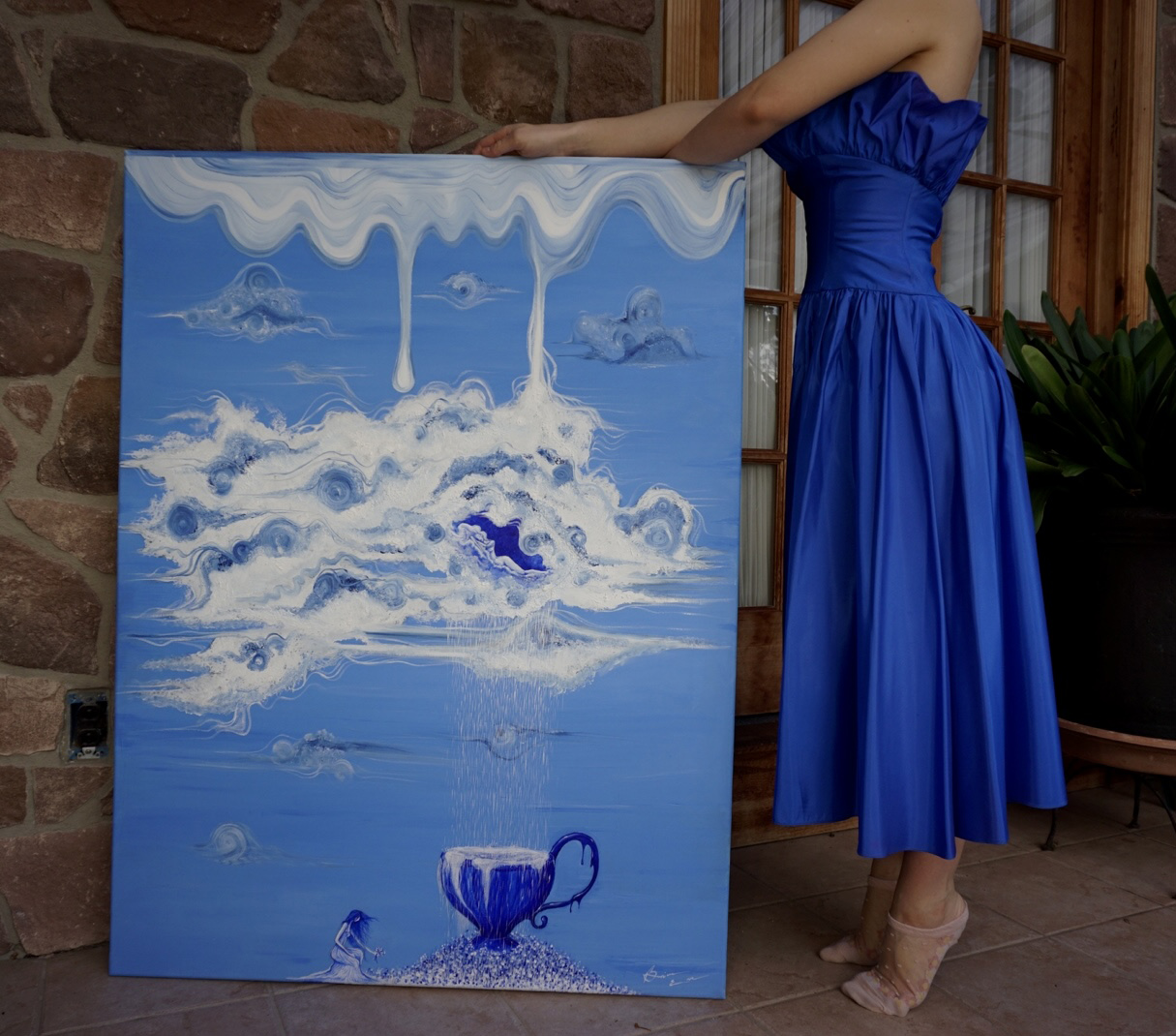 This painting is crafted on a 36x47.5 canvas wrapped around a 3/4" frame. The base color, teacup, flower hill, women, and rain are designed using acrylic paint. The clouds were developed using oil paint and a technique that enhances them with texture. The woman in the clouds was designed on a seperate piece of canvas that was glued onto the larger scene.